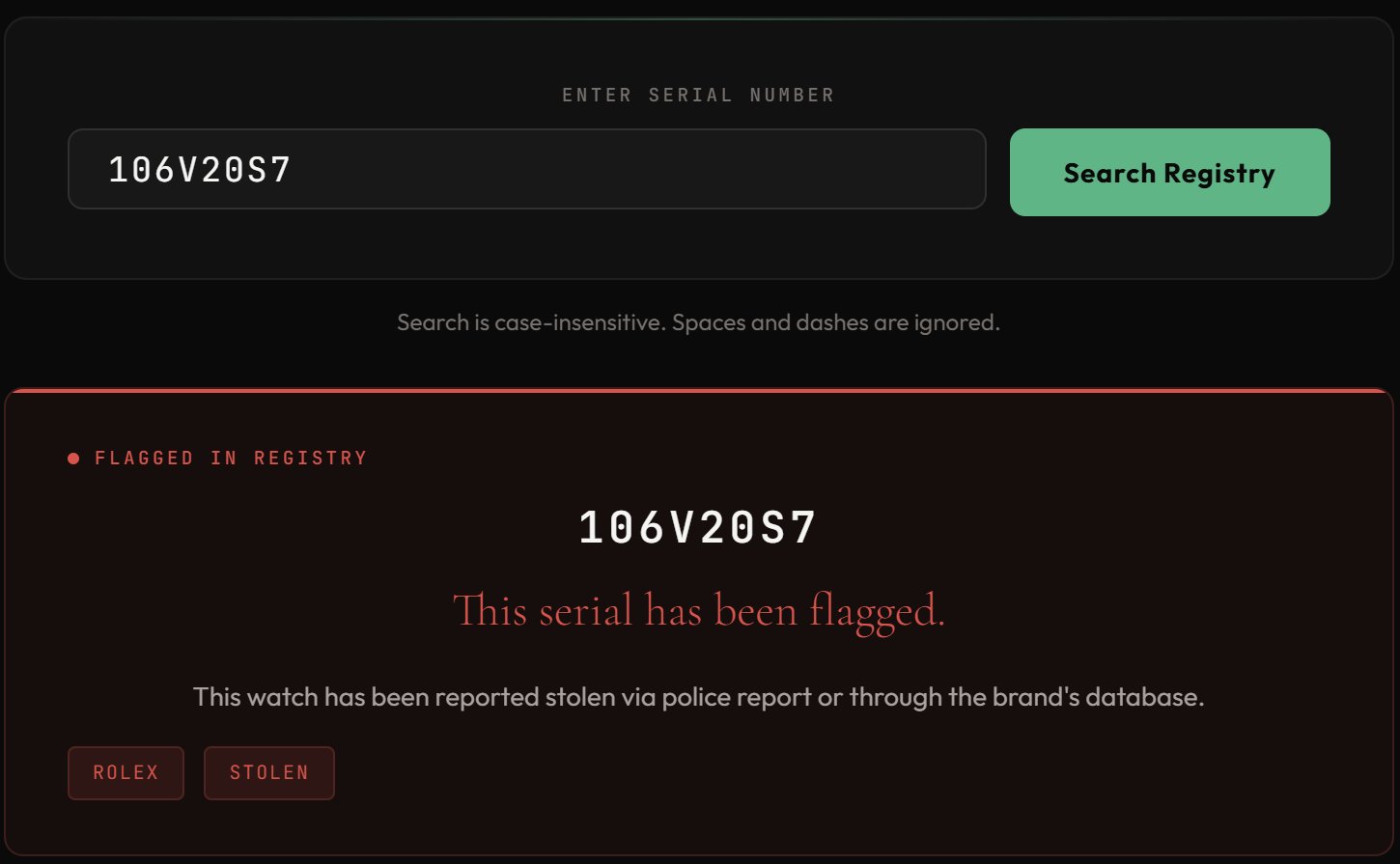 Run any serial number against our flagged serial registry before wiring money. Every serial we've flagged. Stolen, tampered warranty cards, dial swaps, and known fakes — searchable in real time. Active subscribers receive discounted pricing on official database serial checks.